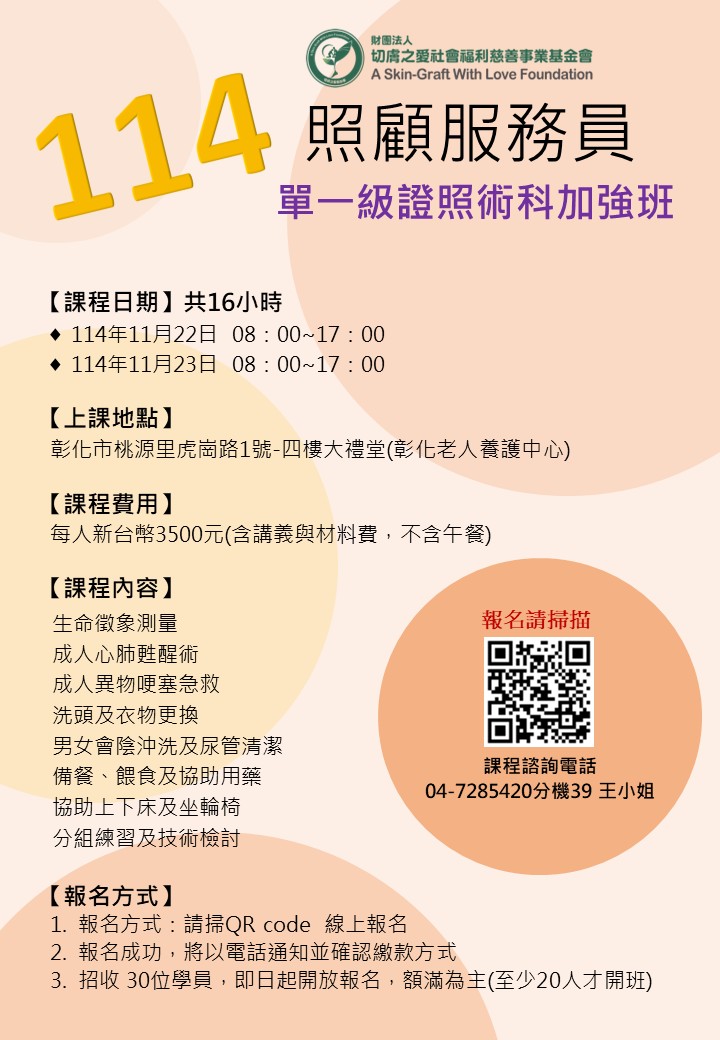 快來報名【114年照顧服務員單ㄧ級證照術科加強班(彰化縣)】,為您的職涯加分!