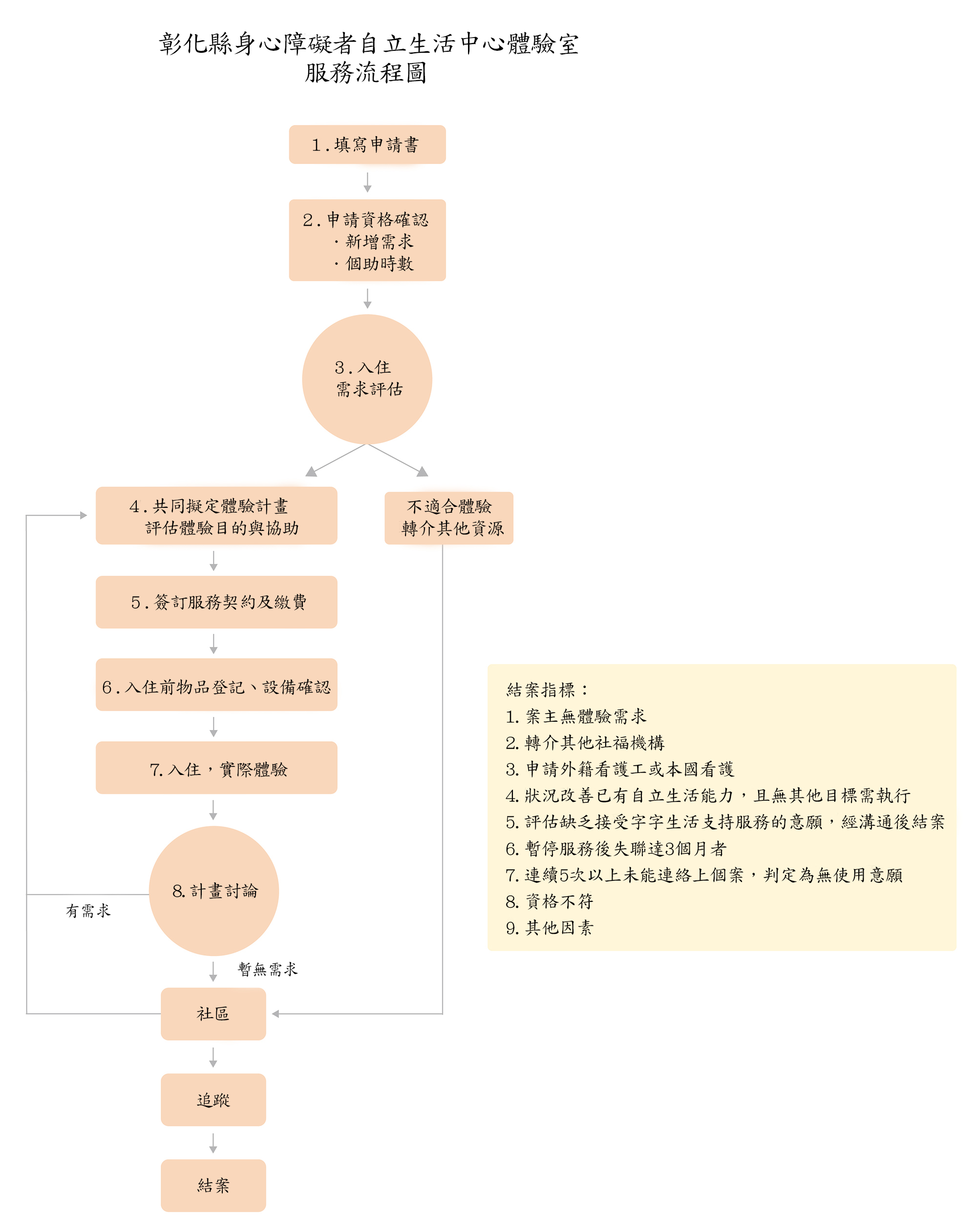 1.中區六縣市(苗栗縣、台中市、彰化縣、南投縣、雲林縣、嘉義縣市),滿18歲以上有自立生活意願及體驗需求之身心障礙者,經需求評估核定通過得以使用身心障礙者自立生活服務,並有身心障礙者自立生活中心體驗需求者。