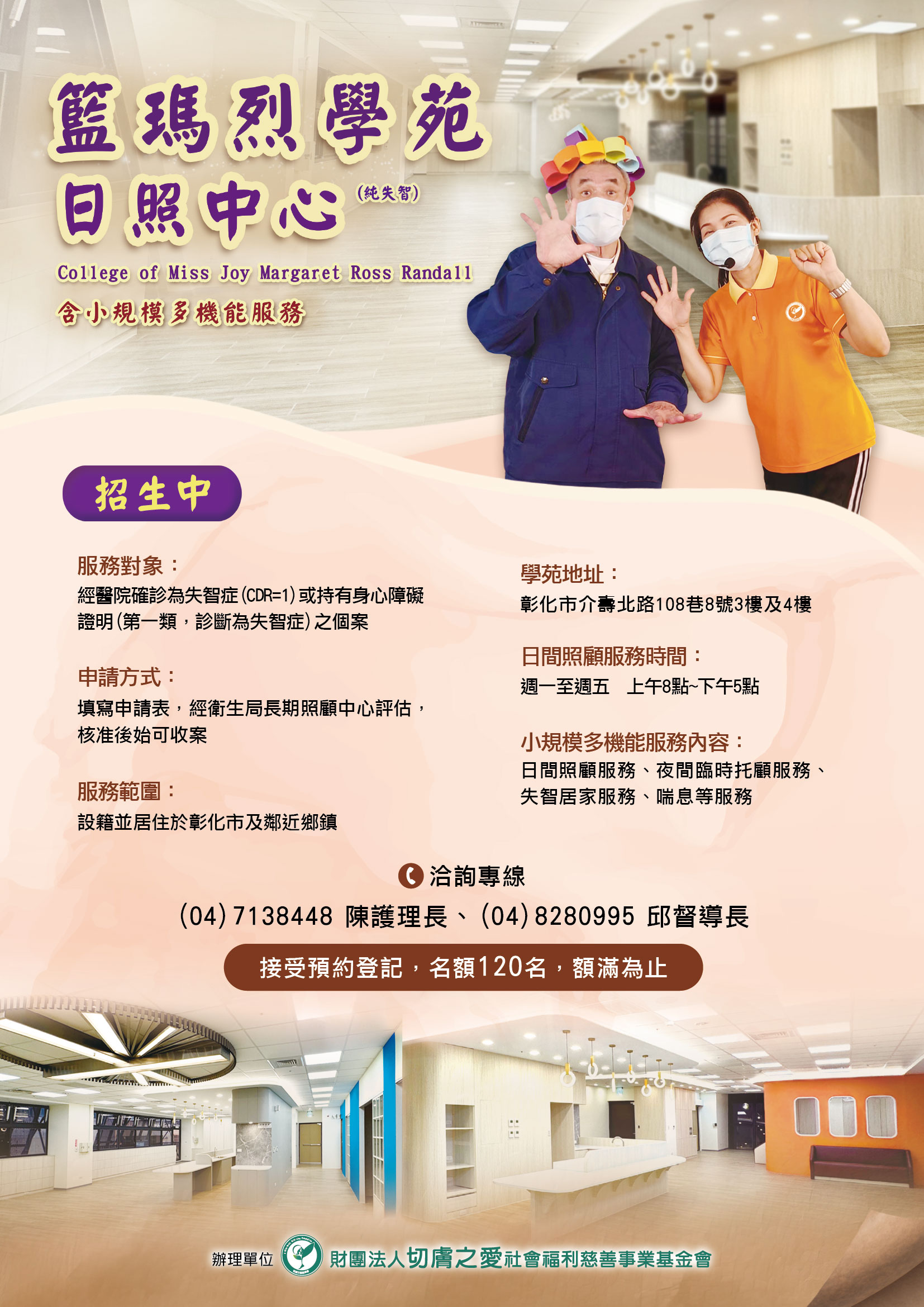 以日間照顧服務為基礎,結合彈性多元的在地社區照顧模式,提供居家服務與夜間臨托,協助減輕家庭照顧者的照顧負擔。